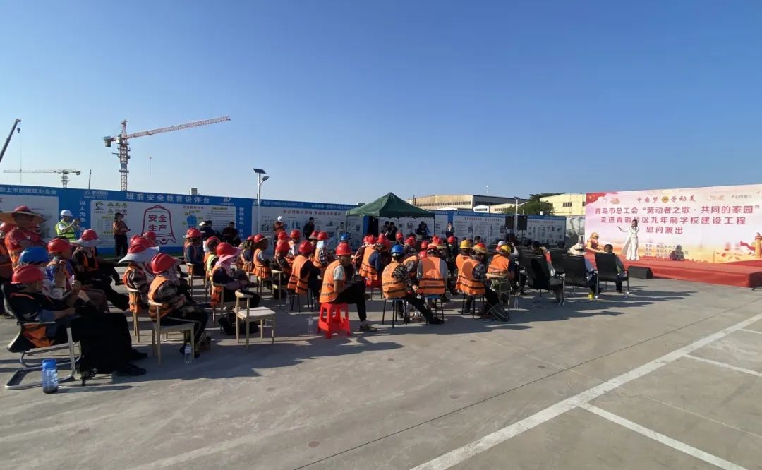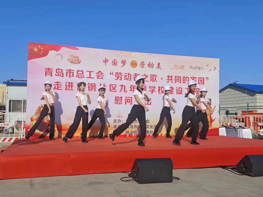 6月17日下午,由青岛市总工会主办、市工人文化宫及楼山街道办事处承办的“劳动者之歌·共同的家园”慰问演出在星空(中国)青钢片区九年制学校工程项目现场举行,项目建筑工人、管理人员近百人观看了演出。