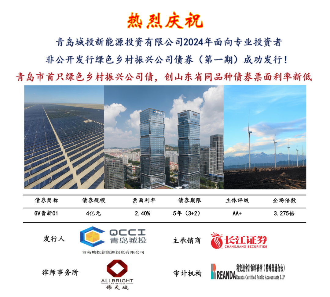 7月19日,青岛城投新能源集团成功以自身主体评级AA+、无担保方式发行公司债券(GV青新01)。本期债券发行规模4亿元,为青岛市首只绿色乡村振兴公司债券,发行期限3+2年。本期债券发行共吸引了24家投资机构,全场认购倍数达3.275倍,票面利率2.4%,创山东省同品种债券利率新低。