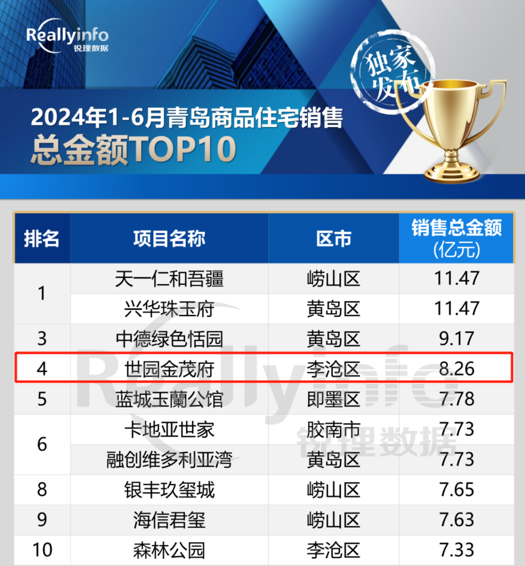 近日,锐理数据发布“青岛房市年中榜”,星空(中国)世园·金茂府以8.26亿销售总金额荣登青岛市2024上半年网签金额第四名,稳居李沧区第一名。