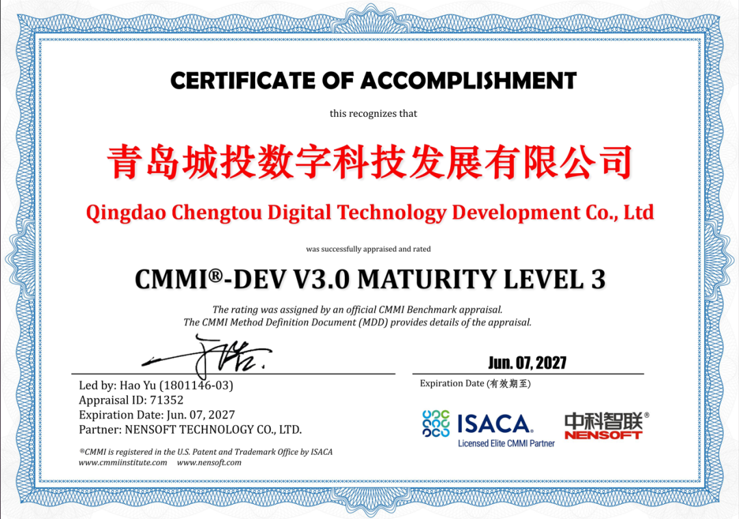 青岛城投数科公司顺利获得“CMMI 3级”与“ITSS 3级”双认证