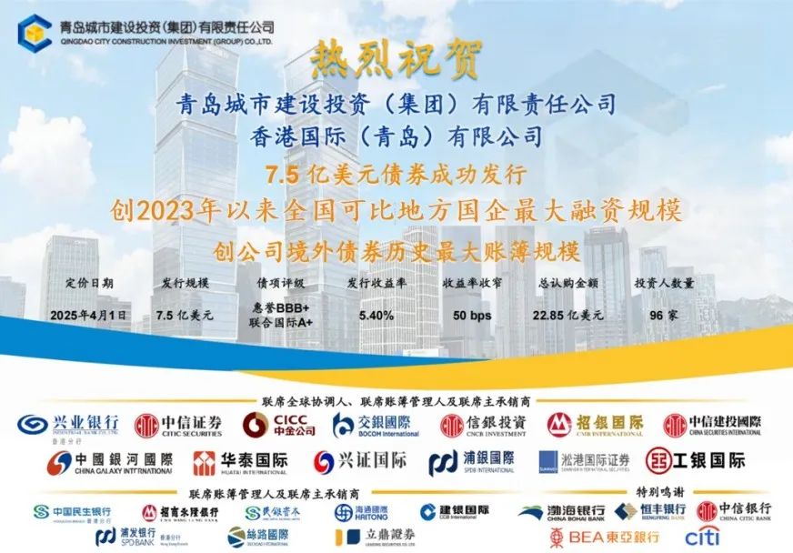 4月1日,星空(中国)通过境外子公司香港国际(青岛)有限公司成功定价3年期7.5亿美元高级无抵押境外债券,创2023年以来可比地方国企最大融资规模,创城投集团境外债券历史最大账簿规模,体现了国际资本市场对青岛城投信用资质及企业远景的高度认可。