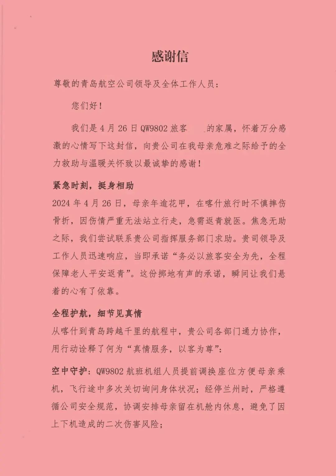 又一封感谢信!青岛航空千里护航受伤老人返青就医