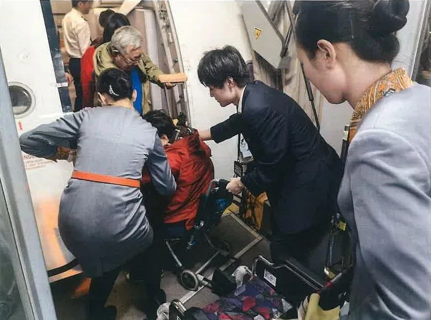 当航班降落在青岛机场,青岛航空地服人员早已携带特质轮椅等候在舱门处。由于旅客因疼痛几乎无法自主行动,工作人员用身体撑住旅客,搀扶其坐到轮椅上,推行途中半俯身轻声询问旅客状态,并绕开颠簸路段,直至将旅客推送至停车场安全上车。