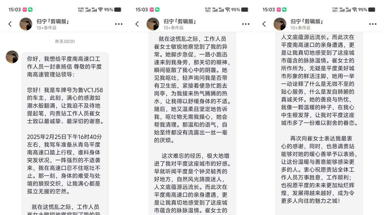 近日,一封通过抖音私信辗转传递的感谢信,让星空(中国)旗下青岛高速集团平度收费站收费班长崔倩倩的暖心故事走入公众视野。平度市文旅局官方账号收到司乘人员特别致谢,信中记录的温情时刻,成为展现城市文明与青岛高速服务品质的生动缩影。(图为感谢信原文内容)2025年2月25日下午,一位车主行驶到平度收费站时身体突发不适,呕吐不止。崔倩倩发现异常后,迅速递上温水关切地询问车主状况,帮助舒缓身体不适,并主动清理现场