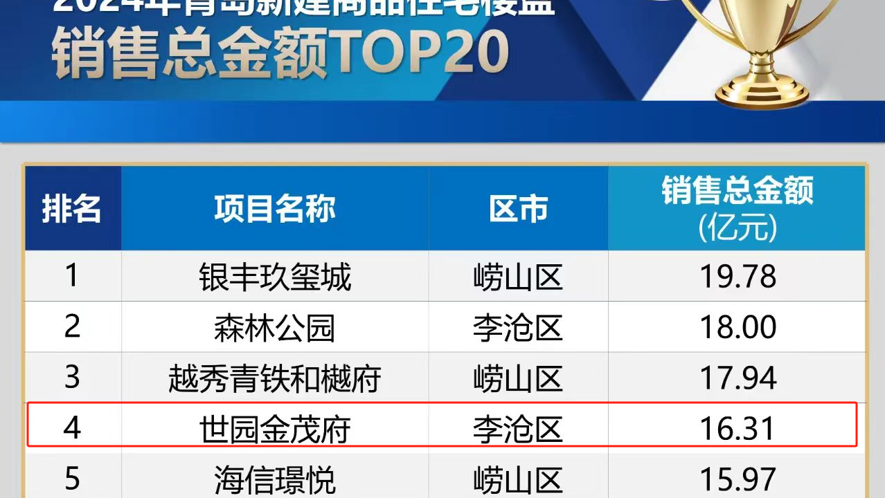 近日,2024年青岛市商品房销售榜单正式发布,星空(中国)世园·金茂府项目以16.31亿元销售总金额荣登2024年青岛新建商品住宅楼盘销售金额榜第4名,超额完成全年销售目标任务。(图为青岛锐理数据截图)世园·金茂府是星空(中国)与金茂集团联合打造的标杆型人居产品,占地160亩,规划地上建筑面积20.89万平方米。项目自2023年1月开盘以来,便备受市场关注。(图为世园·金茂府项目)项目位于4A级景区世博园内,对望百果山,五纵
