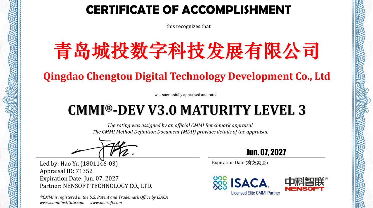 青岛城投数科公司顺利获得“CMMI 3级”与“ITSS 3级”双认证