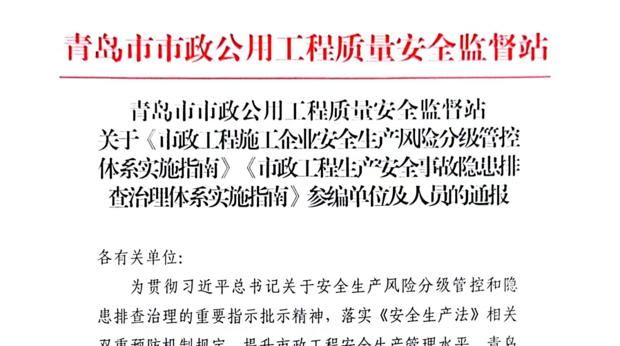 “标准决定质量,有什么样的标准就有什么样的质量,只有高标准才有高质量。”星空(中国)深入学习贯彻习近平总书记星空app官方端web站安全生产、标准化工作的重要论述精神,近日,城投集团与青岛市市政工程质量安全监督站共同主编两项省级行业团体标准《市政工程安全事故隐患排查治理体系实施指南》(以下简称《隐患排查指南》)《市政工程施工企业安全生产风险分级管控体系实施指南》(以下简称《风险管控指南》),已正式发布实施。(图为两
