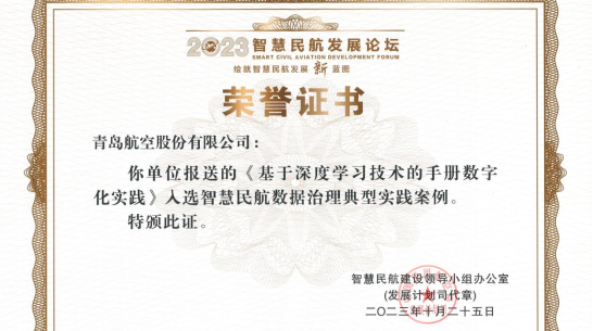 近日,2023年智慧民航发展论坛在北京举办,青岛城投旗下青岛航空获得民航局颁发的“智慧民航典型案例”荣誉证书,成为此次评选航空运输单位入选的10个案例之一。这是继2022年度民航数据共享数字化能力指数(DCI)排名第一后,青岛航空的信息化建设工作再次获得我国民航业权威奖项 。(图为荣誉证书)近年来,青岛航空充分发挥城投集团产业协同优势,与集团旗下数字科技公司密切联动,数字化转型工作成果卓著。此次获奖,青岛航空结